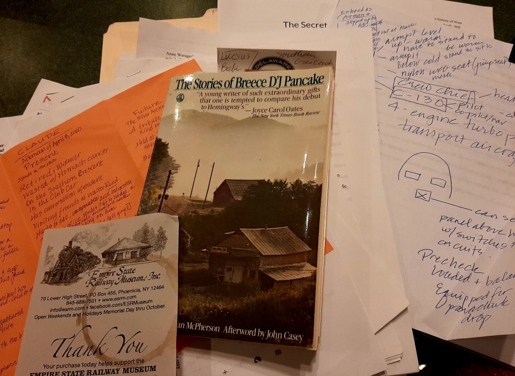 While working on this story, I spent a lot of time listening to Phil Ochs, a musician and lyricist that Pancake loved and admired. I visited railway museums and American Legion halls and asked a lot of questions. I talked with my father-in-law, a steam fitter, about steam engines and the trains that he loved to visit. My friend at work, John Kratch, provided a ton of good conversation about life aboard the C-130. His references to old films and on-board sensations make Claude come to life. Thank you.