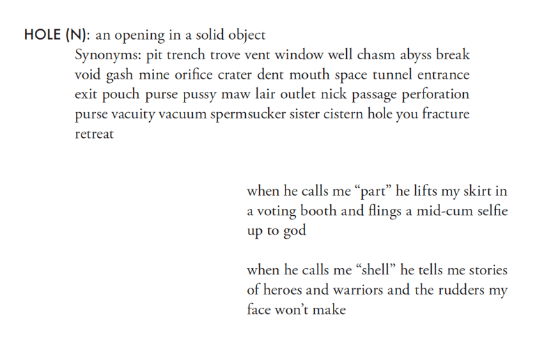 At the end of this section, the speaker wins, as her aggressor disappears in the speaker’s own language, “chokes without permission and fingers back into the world’s curtain, gone.” It’s a triumph, but the cost is exhausting.