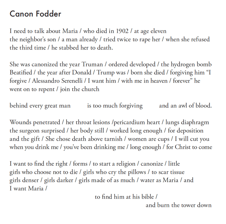 Throughout her collection, Lawson’s speaker is assaulted in myriad ways: criminal aggression (sleezy bosses, traffic cop rapists, and politicians willing to “foie-gras our delicate constitution”), and micro-aggression (1-star reviews of transgender books, insincere left-leaning professors who hand out slacktivist cookies to students). But then, there is the rape of a saint.